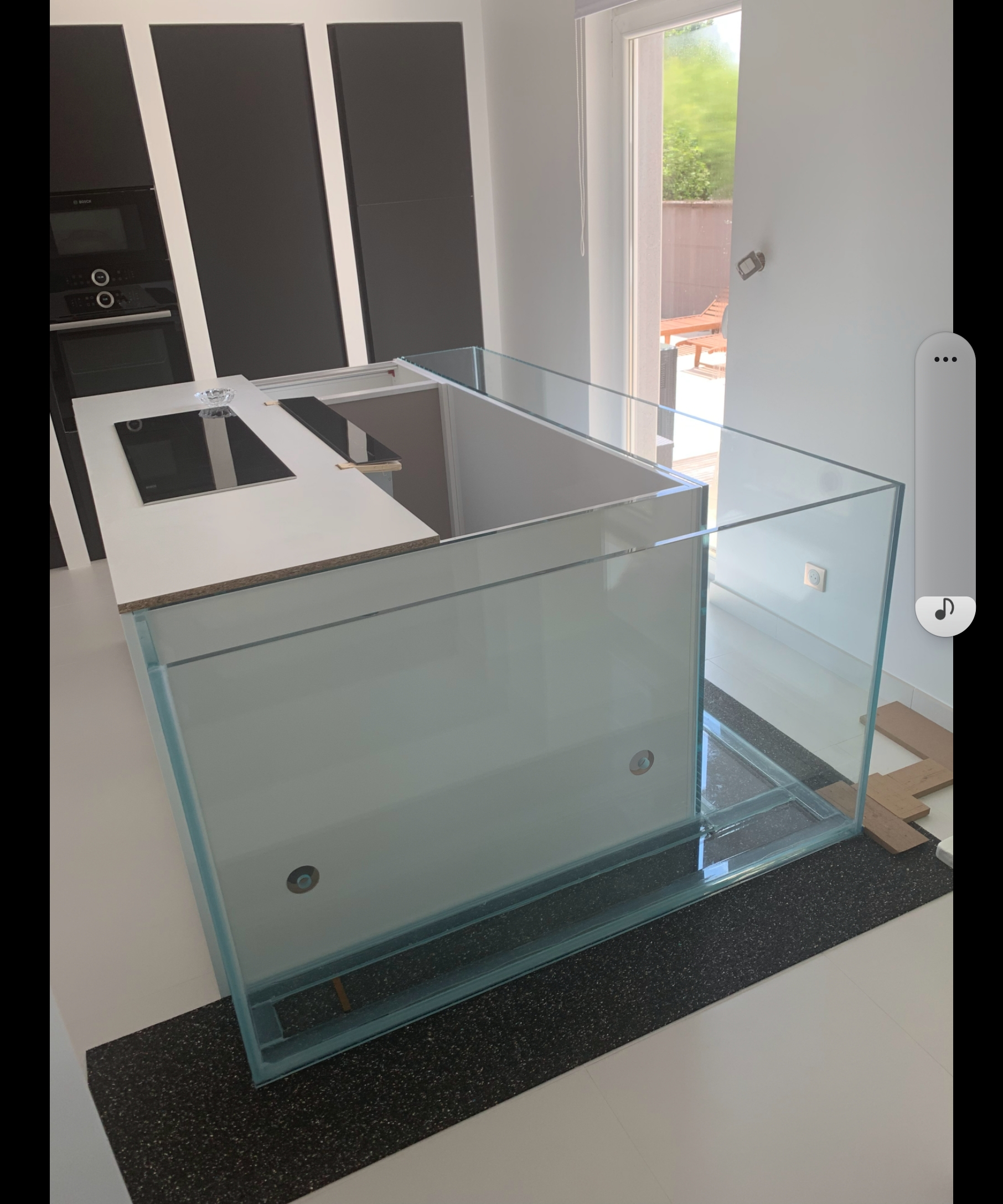 Je vends cet aquarium en L, 1m3. Il s'agit d’une création qui peut être installée autour d’un îlot comme sur la photo ou pour créer un bar.