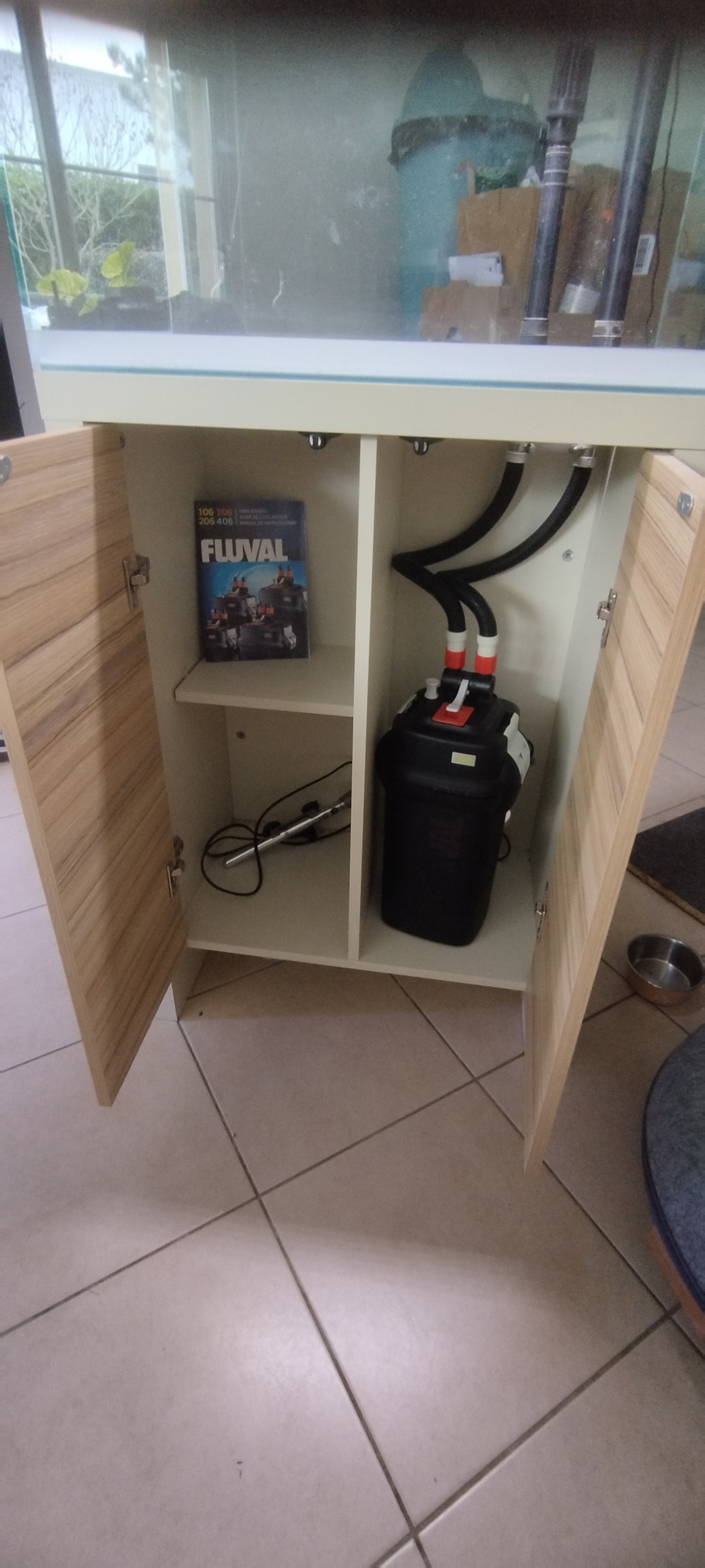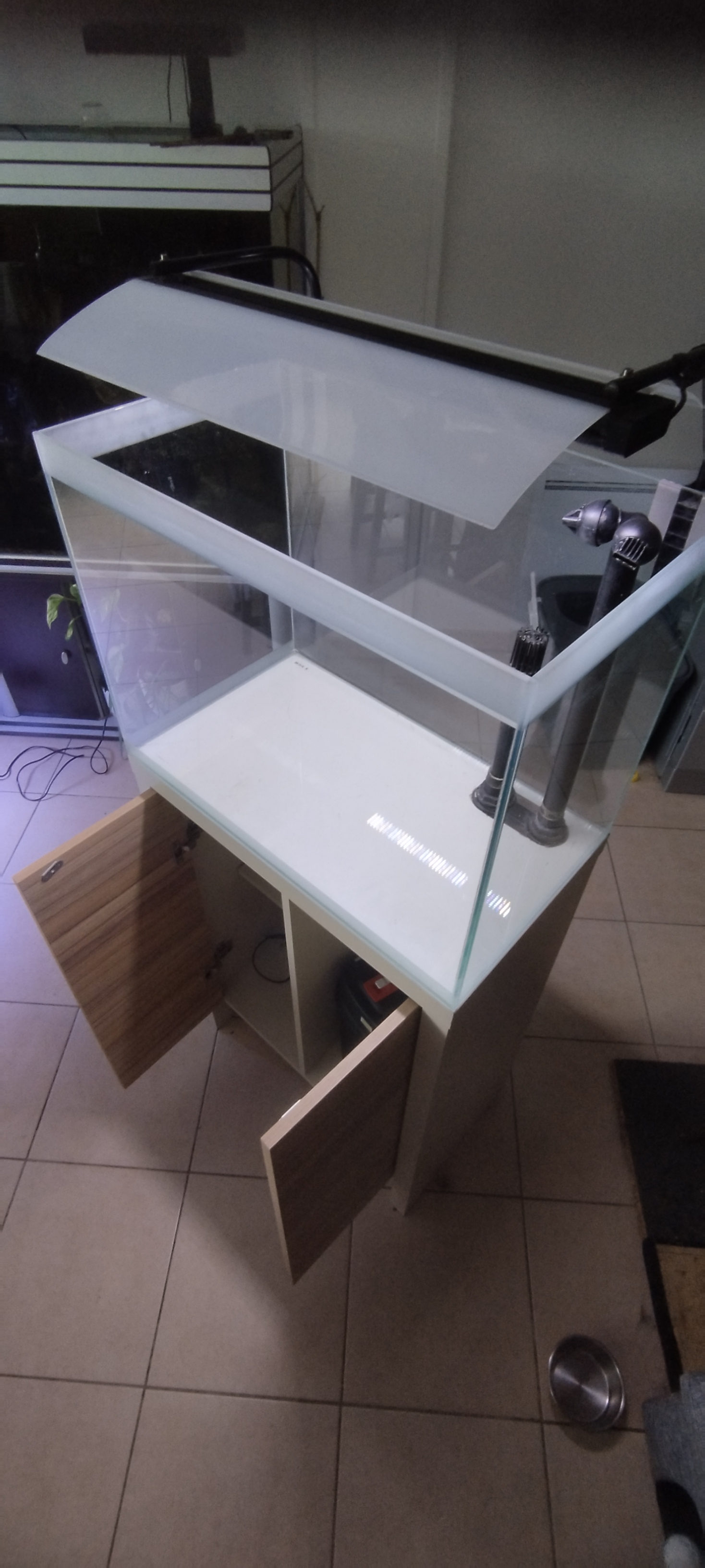 Aquarium assez design avec un verre sablé (dépoli) sur les quelques premièrs centimes du haut et du bas permettant de cacher le sol et les marques de calclaires futures, filtration externe fournie elle est intégré par le bas a l'aquarium donc pas de tuyaux inesthétique et facile à gérer pour l'entretien, fournis également avec sa rampe led réglable et deux réflecteurs en plastique ainsi que son chauffage et son meuble bien sûr pour la filtration par les bas, le tout est en plutot bon état quelques marques d'usure sur le meuble et quelques micro rayures sur le verre invisible en haut et peu nombreuses.