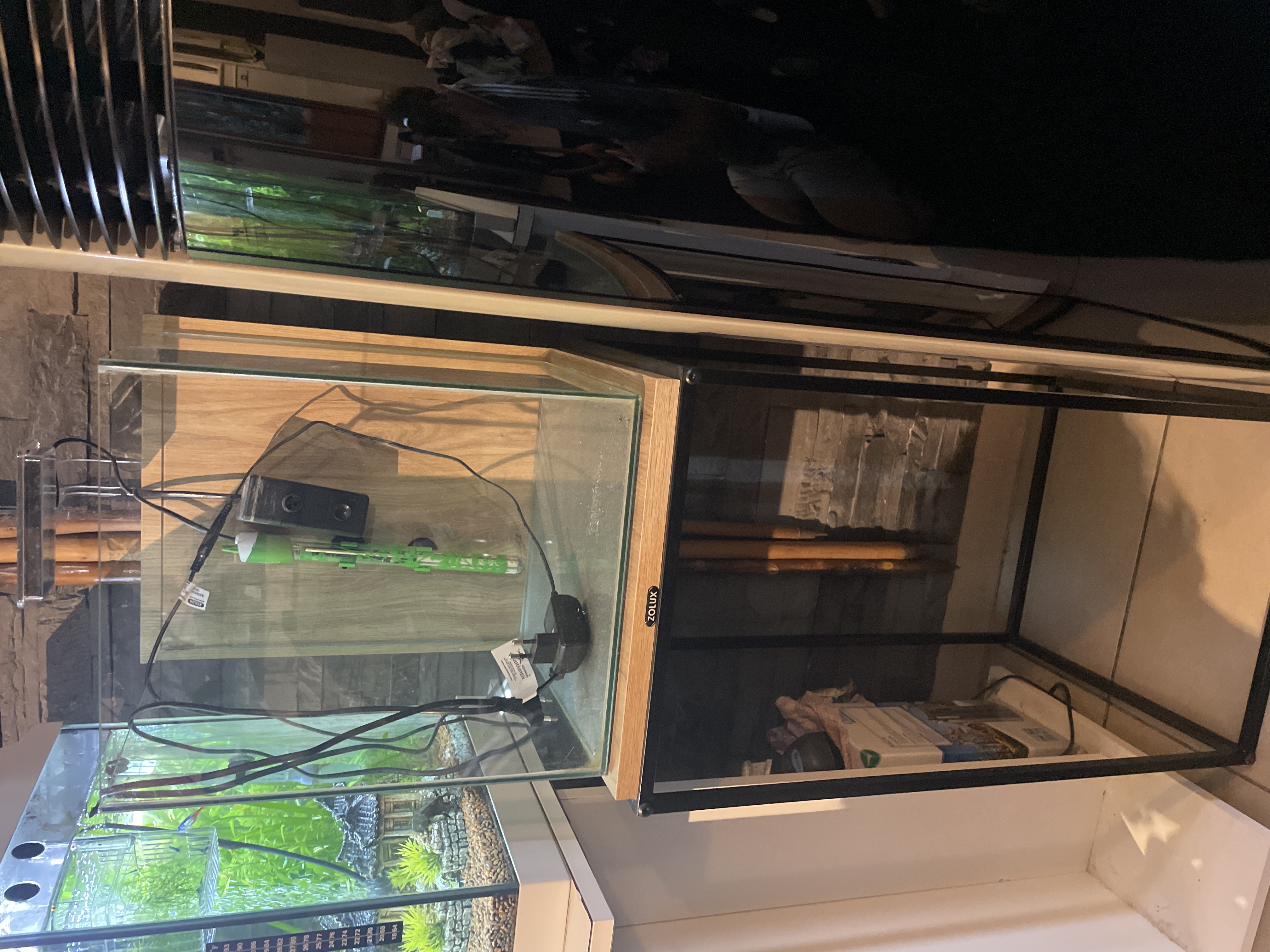 Super aquarium 40 l de marque zolux complet, chauffage, lumière, led, deux couleurs blanc et bleu, chauffage posé sur un meuble