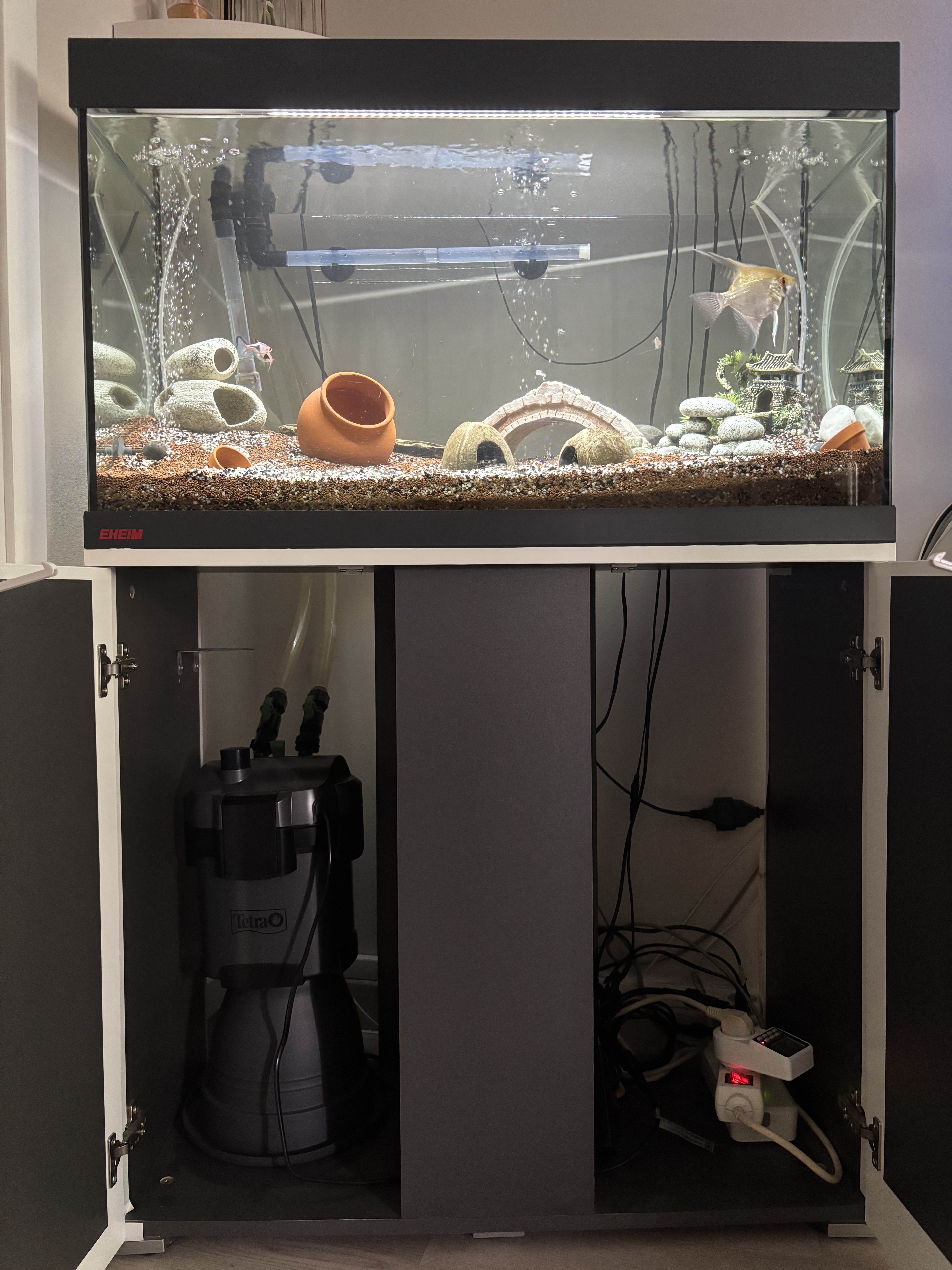 Filtration : Pompe externe Tetra EX 500 PLUS (débit 910 L/h), achetée en 2024 à 99 €. Très silencieuse et efficace