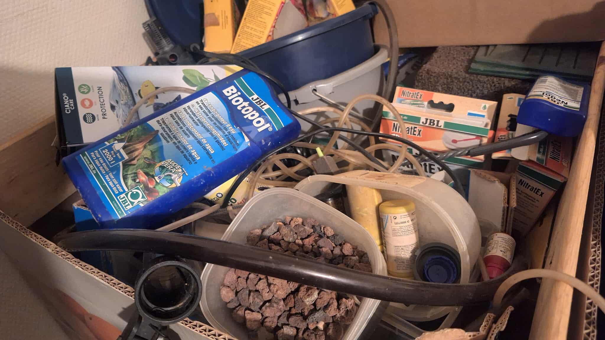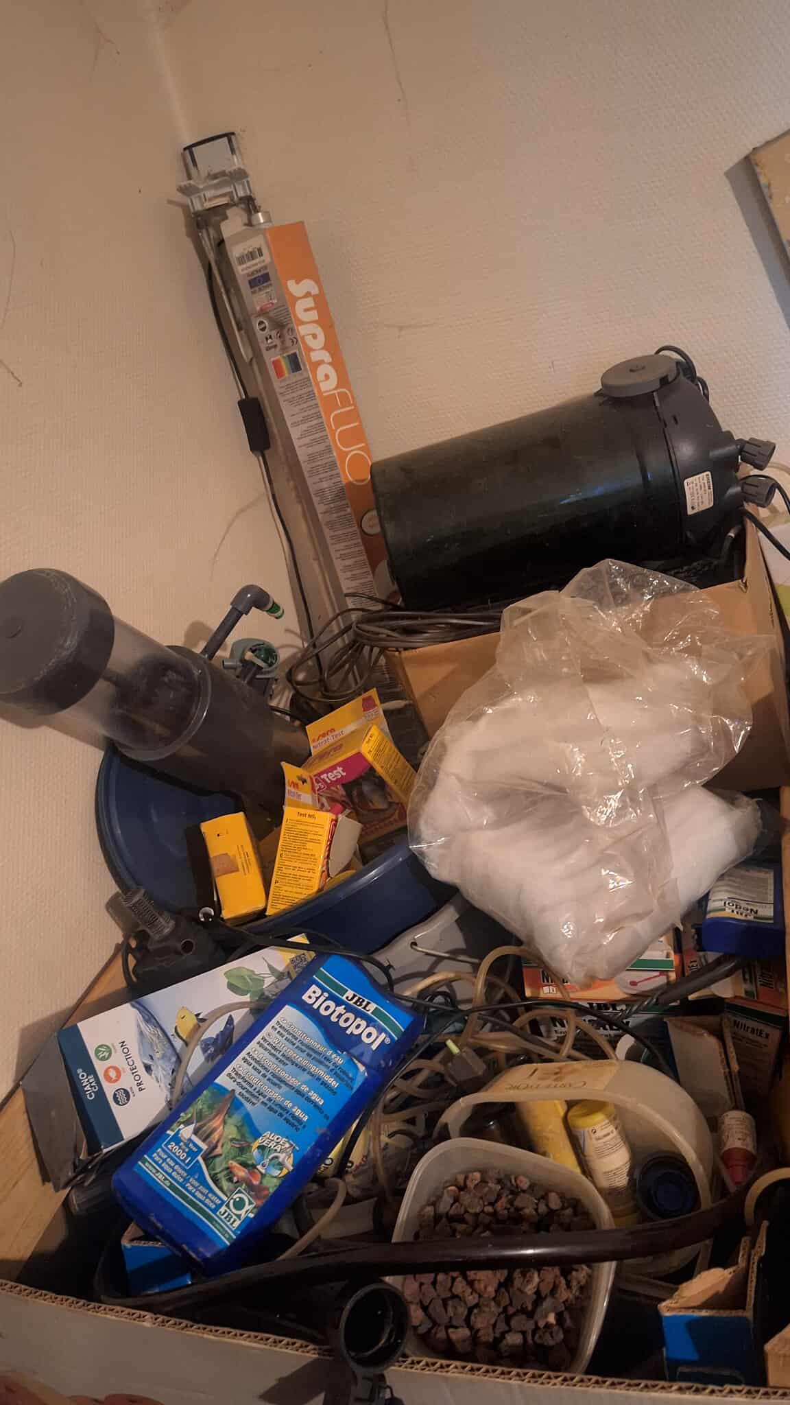 Je vend une très grande caisse remplie d'accessoires aquarium divers (pompes, tuyaux, filtres, mousses, conditionneurs et produits d'entretien de l'eau, nourriture, néons, chauffage, pouzolane, épuisettes....)